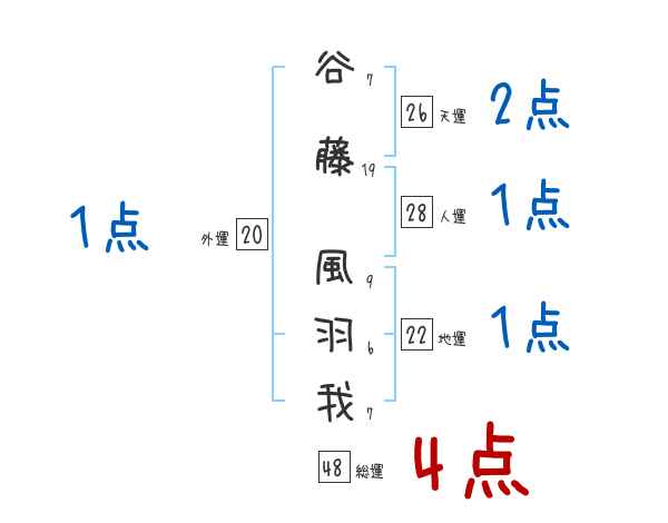 総運![]() | 谷藤風羽我さんの総運は48画の4つ星!賢明な性格で人望が厚い。指導力があり多くの人に尊敬される。 あなたの人生を表す1番重要な運勢です。生涯を通じて影響する総合運となり、主に50歳以降の晩年期に影響を及ぼします。 |