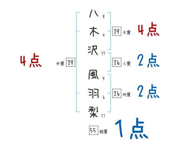 天運![]() | 八木沢風羽梨さんの天運は29画の4つ星!完全主義で才能がある。厳格な心の持ち主。 家系が持つ宿命的な運勢を表します。祖先から受け継いだ苗字ですので自分の力が及びません。家柄を象徴します。 |