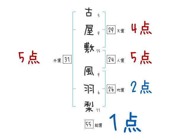 天運![]() | 古屋敷風羽梨さんの天運は29画の4つ星!完全主義で才能がある。厳格な心の持ち主。 家系が持つ宿命的な運勢を表します。祖先から受け継いだ苗字ですので自分の力が及びません。家柄を象徴します。 |