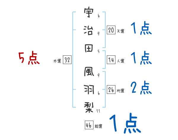 外運![]() | 宇治田風羽梨さんの外運は32画の5つ星!柔軟性があり成功する。チャンスが多く金運が良い。 生活面を象徴する運勢です。外部から受ける影響力を表し、結婚運、家庭運や職場、環境への順応性を表します。 |