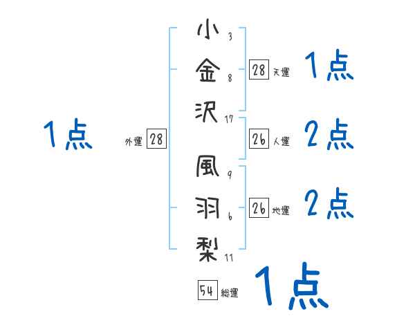 外運![]() | 小金沢風羽梨さんの外運は28画の1つ星!家庭環境に注意。スポーツで活躍できる能力があるかも。 生活面を象徴する運勢です。外部から受ける影響力を表し、結婚運、家庭運や職場、環境への順応性を表します。 |
