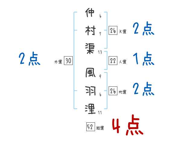 天運![]() | 仲村渠風羽浬さんの天運は26画の2つ星!波瀾万丈かも。信頼できる人を大事にしましょう。 家系が持つ宿命的な運勢を表します。祖先から受け継いだ苗字ですので自分の力が及びません。家柄を象徴します。 |