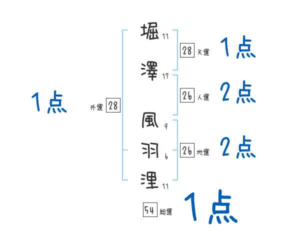 天運![]() | 堀澤風羽浬さんの天運は28画の1つ星!家庭環境に注意。スポーツで活躍できる能力があるかも。 家系が持つ宿命的な運勢を表します。祖先から受け継いだ苗字ですので自分の力が及びません。家柄を象徴します。 |