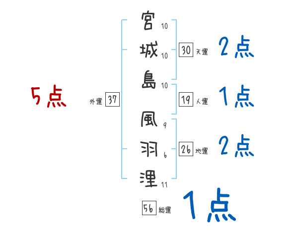 天運![]() | 宮城島風羽浬さんの天運は30画の2つ星!浮き沈みの激しさに注意しましょう。 家系が持つ宿命的な運勢を表します。祖先から受け継いだ苗字ですので自分の力が及びません。家柄を象徴します。 |