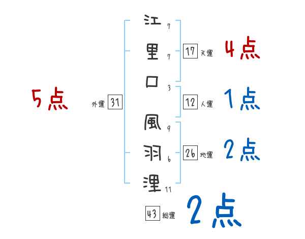 天運![]() | 江里口風羽浬さんの天運は17画の4つ星!積極的な行動力。地位を気づき財産を手に入れる。純粋な心と直感力。 家系が持つ宿命的な運勢を表します。祖先から受け継いだ苗字ですので自分の力が及びません。家柄を象徴します。 |