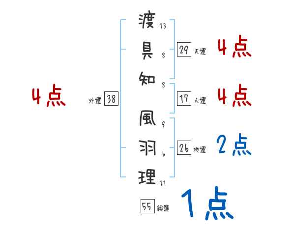 外運![]() | 渡具知風羽理さんの外運は38画の4つ星!温厚な性格で技術的な才能を発揮する。職人的な仕事に向いている。 生活面を象徴する運勢です。外部から受ける影響力を表し、結婚運、家庭運や職場、環境への順応性を表します。 |
