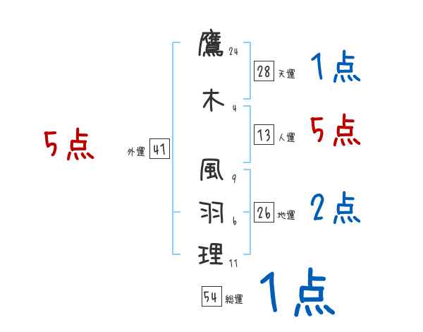 天運![]() | 鷹木風羽理さんの天運は28画の1つ星!家庭環境に注意。スポーツで活躍できる能力があるかも。 家系が持つ宿命的な運勢を表します。祖先から受け継いだ苗字ですので自分の力が及びません。家柄を象徴します。 |