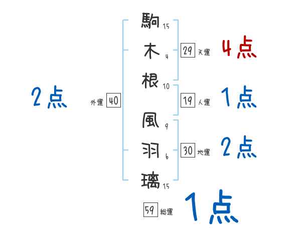 天運![]() | 駒木根風羽璃さんの天運は29画の4つ星!完全主義で才能がある。厳格な心の持ち主。 家系が持つ宿命的な運勢を表します。祖先から受け継いだ苗字ですので自分の力が及びません。家柄を象徴します。 |