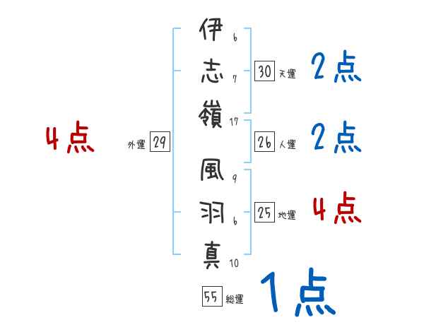 外運![]() | 伊志嶺風羽真さんの外運は29画の4つ星!完全主義で才能がある。厳格な心の持ち主。 生活面を象徴する運勢です。外部から受ける影響力を表し、結婚運、家庭運や職場、環境への順応性を表します。 |