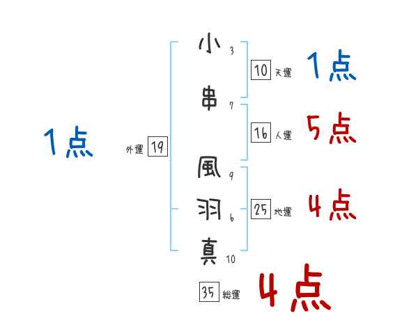外運![]() | 小串風羽真さんの外運は19画の1つ星!優れた才能を持ちますが、協調性が足りないことも。周りの人と協力する事を意識しましょう。 生活面を象徴する運勢です。外部から受ける影響力を表し、結婚運、家庭運や職場、環境への順応性を表します。 |