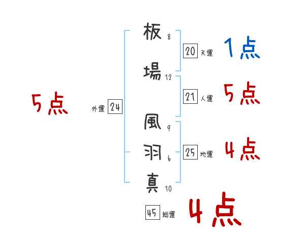 人運![]() | 板場風羽真さんの人運は21画の5つ星!統率力がある。独立し成功する。名誉を手に入れる。 性格や才能などを表す2番目に重要な運勢です。人間関係や協調性、社会的な成功に影響します。主に20歳から50歳ぐらいまでの中年期の運勢を表します。 |