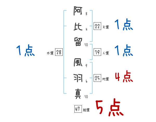 総運![]() | 阿比留風羽真さんの総運は47画の5つ星!実力が開花し発展する円満な人生。財に恵まれる。 あなたの人生を表す1番重要な運勢です。生涯を通じて影響する総合運となり、主に50歳以降の晩年期に影響を及ぼします。 |