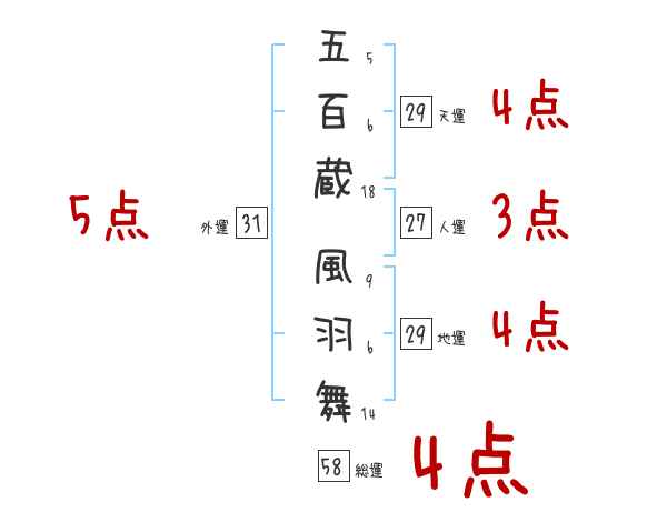 天運![]() | 五百蔵風羽舞さんの天運は29画の4つ星!完全主義で才能がある。厳格な心の持ち主。 家系が持つ宿命的な運勢を表します。祖先から受け継いだ苗字ですので自分の力が及びません。家柄を象徴します。 |