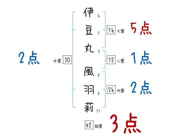 天運![]() | 伊豆丸風羽莉さんの天運は16画の5つ星!人望が厚く大きく発展する。逆転成功が見える。 家系が持つ宿命的な運勢を表します。祖先から受け継いだ苗字ですので自分の力が及びません。家柄を象徴します。 |