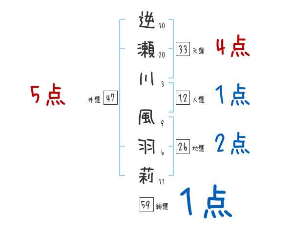 天運![]() | 逆瀬川風羽莉さんの天運は33画の4つ星!権力志向でプライドが高い。勇気があり運を切り開き成功する。 家系が持つ宿命的な運勢を表します。祖先から受け継いだ苗字ですので自分の力が及びません。家柄を象徴します。 |