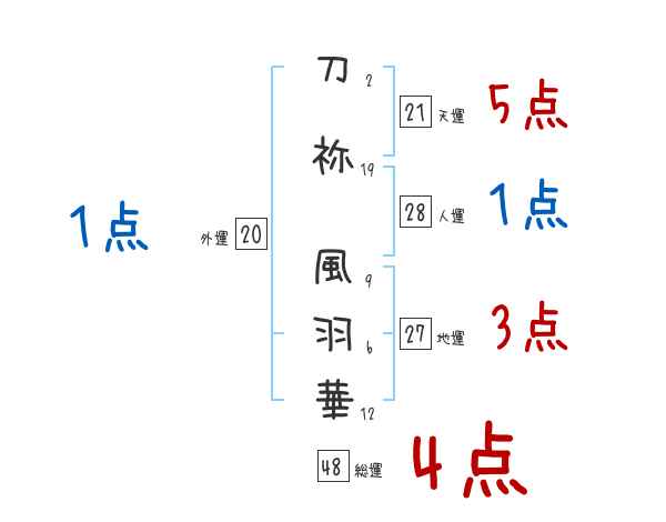 天運![]() | 刀祢風羽華さんの天運は21画の5つ星!統率力がある。独立し成功する。名誉を手に入れる。 家系が持つ宿命的な運勢を表します。祖先から受け継いだ苗字ですので自分の力が及びません。家柄を象徴します。 |