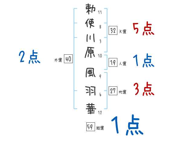 天運![]() | 勅使川原風羽華さんの天運は32画の5つ星!柔軟性があり成功する。チャンスが多く金運が良い。 家系が持つ宿命的な運勢を表します。祖先から受け継いだ苗字ですので自分の力が及びません。家柄を象徴します。 |