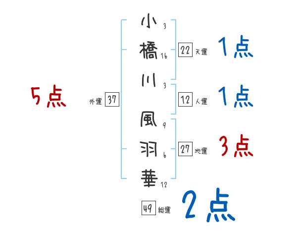 天運![]() | 小橋川風羽華さんの天運は22画の1つ星!努力することが苦手ないっぽう手先が器用。芸術性にも優れる。 家系が持つ宿命的な運勢を表します。祖先から受け継いだ苗字ですので自分の力が及びません。家柄を象徴します。 |