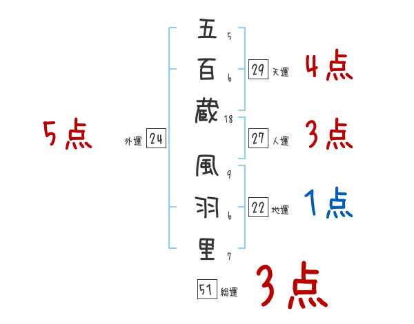 外運![]() | 五百蔵風羽里さんの外運は24画の5つ星!家庭運が良く順調な人生。金運にも恵まれる。 生活面を象徴する運勢です。外部から受ける影響力を表し、結婚運、家庭運や職場、環境への順応性を表します。 |