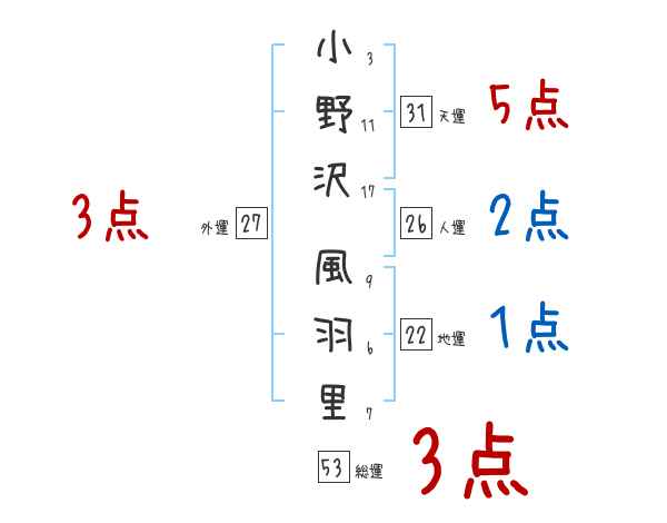 総運![]() | 小野沢風羽里さんの総運は53画の3つ星!やや見栄っ張りで虚栄心がある。散財に注意。 あなたの人生を表す1番重要な運勢です。生涯を通じて影響する総合運となり、主に50歳以降の晩年期に影響を及ぼします。 |