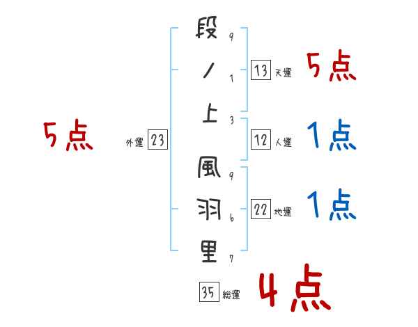 総運![]() | 段ノ上風羽里さんの総運は35画の4つ星!温厚な性格で感受性が高い。穏和な性格で人望が厚い。 あなたの人生を表す1番重要な運勢です。生涯を通じて影響する総合運となり、主に50歳以降の晩年期に影響を及ぼします。 |