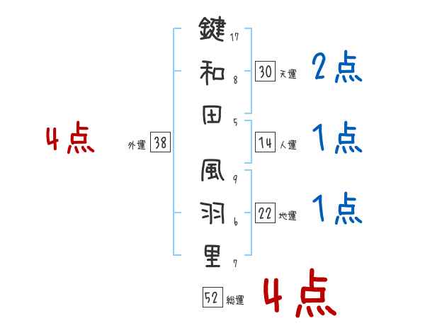 外運![]() | 鍵和田風羽里さんの外運は38画の4つ星!温厚な性格で技術的な才能を発揮する。職人的な仕事に向いている。 生活面を象徴する運勢です。外部から受ける影響力を表し、結婚運、家庭運や職場、環境への順応性を表します。 |