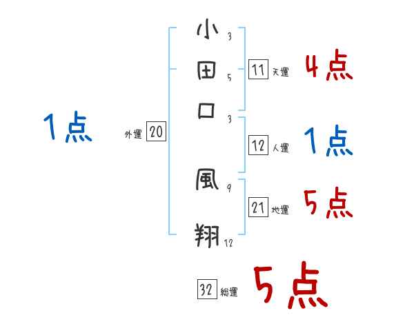 総運![]() | 小田口風翔さんの総運は32画の5つ星!柔軟性があり成功する。チャンスが多く金運が良い。 あなたの人生を表す1番重要な運勢です。生涯を通じて影響する総合運となり、主に50歳以降の晩年期に影響を及ぼします。 |