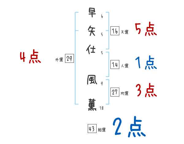 天運![]() | 早矢仕風薫さんの天運は16画の5つ星!人望が厚く大きく発展する。逆転成功が見える。 家系が持つ宿命的な運勢を表します。祖先から受け継いだ苗字ですので自分の力が及びません。家柄を象徴します。 |