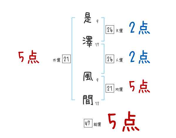 外運![]() | 是澤風間さんの外運は21画の5つ星!統率力がある。独立し成功する。名誉を手に入れる。 生活面を象徴する運勢です。外部から受ける影響力を表し、結婚運、家庭運や職場、環境への順応性を表します。 |