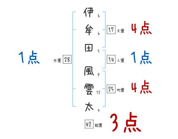 総運![]() | 伊牟田風雲太さんの総運は42画の3つ星!病気に注意。多芸であるが消極的でおとなしい。 あなたの人生を表す1番重要な運勢です。生涯を通じて影響する総合運となり、主に50歳以降の晩年期に影響を及ぼします。 |