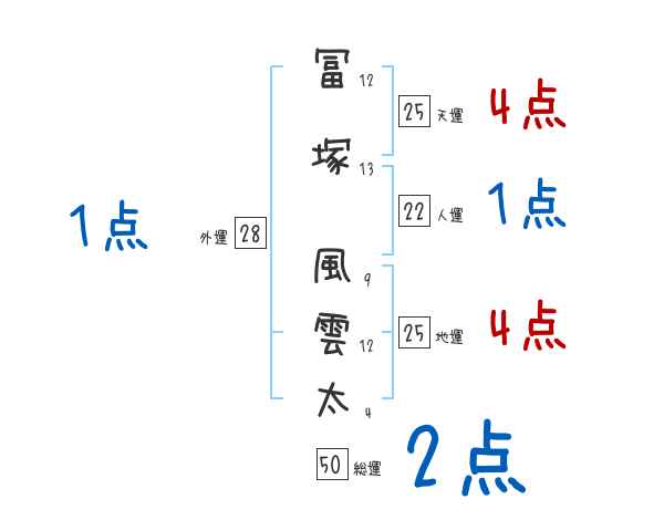 外運![]() | 冨塚風雲太さんの外運は28画の1つ星!家庭環境に注意。スポーツで活躍できる能力があるかも。 生活面を象徴する運勢です。外部から受ける影響力を表し、結婚運、家庭運や職場、環境への順応性を表します。 |