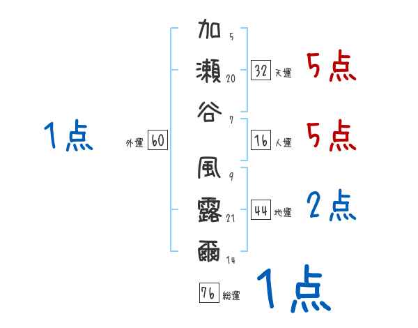 総運![]() | 加瀬谷風露爾さんの総運は76画の1つ星!離散に注意。劣等感を感じ孤立しやすい傾向があるかも。 あなたの人生を表す1番重要な運勢です。生涯を通じて影響する総合運となり、主に50歳以降の晩年期に影響を及ぼします。 |