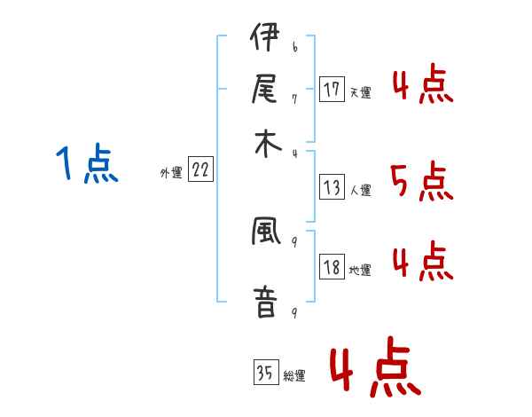 総運![]() | 伊尾木風音さんの総運は35画の4つ星!温厚な性格で感受性が高い。穏和な性格で人望が厚い。 あなたの人生を表す1番重要な運勢です。生涯を通じて影響する総合運となり、主に50歳以降の晩年期に影響を及ぼします。 |
