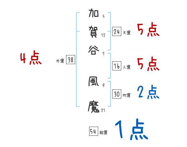 天運![]() | 加賀谷風魔さんの天運は24画の5つ星!家庭運が良く順調な人生。金運にも恵まれる。 家系が持つ宿命的な運勢を表します。祖先から受け継いだ苗字ですので自分の力が及びません。家柄を象徴します。 |
