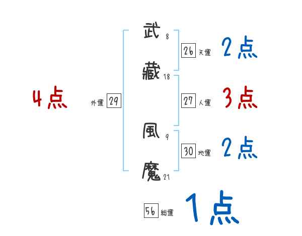 天運![]() | 武藏風魔さんの天運は26画の2つ星!波瀾万丈かも。信頼できる人を大事にしましょう。 家系が持つ宿命的な運勢を表します。祖先から受け継いだ苗字ですので自分の力が及びません。家柄を象徴します。 |