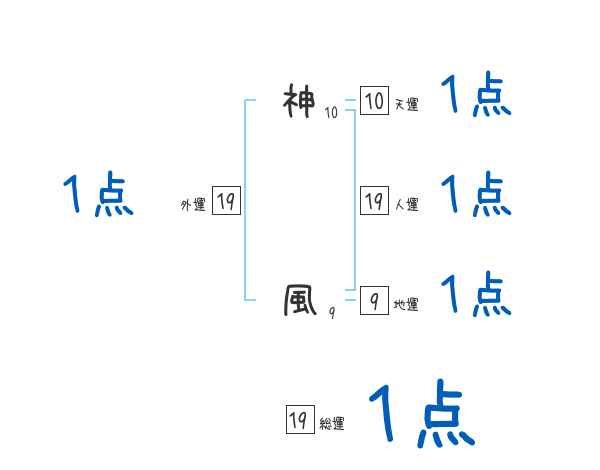 外運![]() | 神風さんの外運は19画の1つ星!優れた才能を持ちますが、協調性が足りないことも。周りの人と協力する事を意識しましょう。 生活面を象徴する運勢です。外部から受ける影響力を表し、結婚運、家庭運や職場、環境への順応性を表します。 |