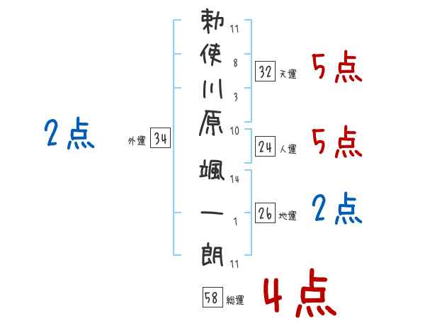 天運![]() | 勅使川原颯一朗さんの天運は32画の5つ星!柔軟性があり成功する。チャンスが多く金運が良い。 家系が持つ宿命的な運勢を表します。祖先から受け継いだ苗字ですので自分の力が及びません。家柄を象徴します。 |