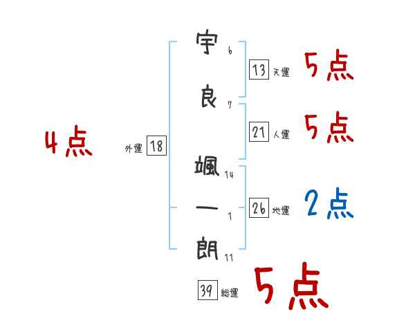 宇良颯一朗さんの画数の鑑定結果