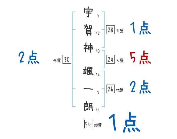 地運![]() | 宇賀神颯一朗さんの地運は26画の2つ星!波瀾万丈かも。信頼できる人を大事にしましょう。 個性を表す基礎的な運勢です。性格形成や対人関係、行動力など家庭環境に影響されます。主に誕生してから20歳くらいまでの若年期の運勢を表します。 |