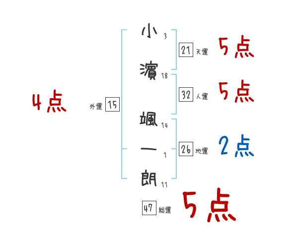 人運![]() | 小濵颯一朗さんの人運は32画の5つ星!柔軟性があり成功する。チャンスが多く金運が良い。 性格や才能などを表す2番目に重要な運勢です。人間関係や協調性、社会的な成功に影響します。主に20歳から50歳ぐらいまでの中年期の運勢を表します。 |