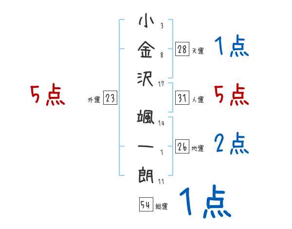 外運![]() | 小金沢颯一朗さんの外運は23画の5つ星!想像力に優れ活力がある。一代で成功し名誉を手に入れる。 生活面を象徴する運勢です。外部から受ける影響力を表し、結婚運、家庭運や職場、環境への順応性を表します。 |