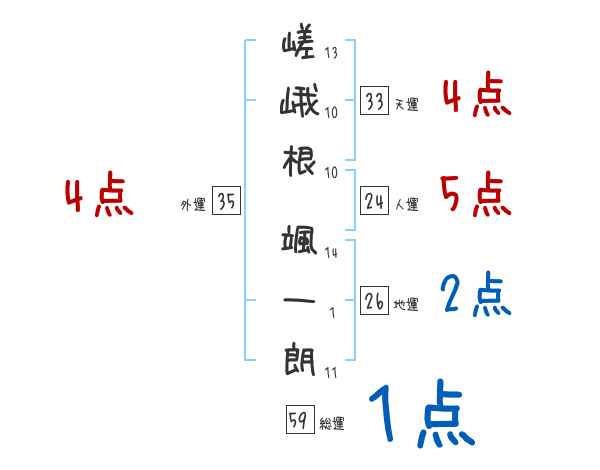 外運![]() | 嵯峨根颯一朗さんの外運は35画の4つ星!温厚な性格で感受性が高い。穏和な性格で人望が厚い。 生活面を象徴する運勢です。外部から受ける影響力を表し、結婚運、家庭運や職場、環境への順応性を表します。 |