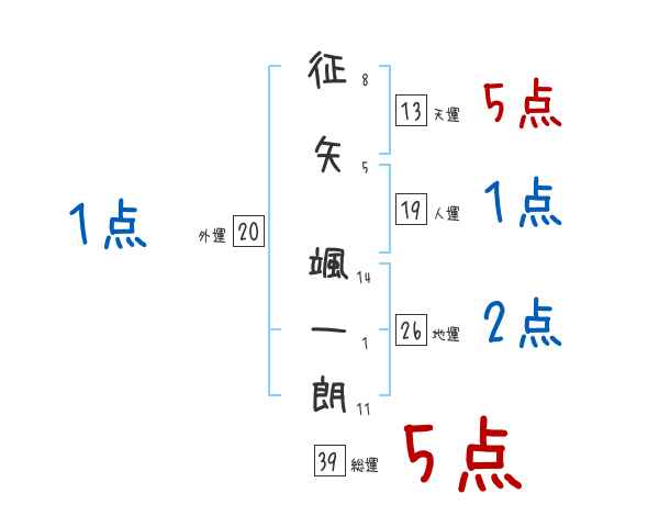 人運![]() | 征矢颯一朗さんの人運は19画の1つ星!優れた才能を持ちますが、協調性が足りないことも。周りの人と協力する事を意識しましょう。 性格や才能などを表す2番目に重要な運勢です。人間関係や協調性、社会的な成功に影響します。主に20歳から50歳ぐらいまでの中年期の運勢を表します。 |