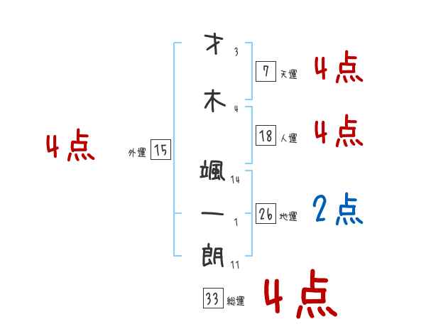 外運![]() | 才木颯一朗さんの外運は15画の4つ星!人徳があり出世する。順調に物事を進め円満な人生。 生活面を象徴する運勢です。外部から受ける影響力を表し、結婚運、家庭運や職場、環境への順応性を表します。 |