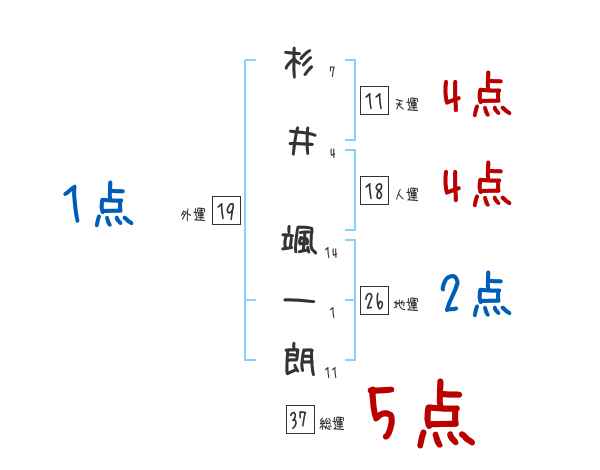 天運![]() | 杉井颯一朗さんの天運は11画の4つ星!着実に富や地位を得る幸運な人生。 家系が持つ宿命的な運勢を表します。祖先から受け継いだ苗字ですので自分の力が及びません。家柄を象徴します。 |