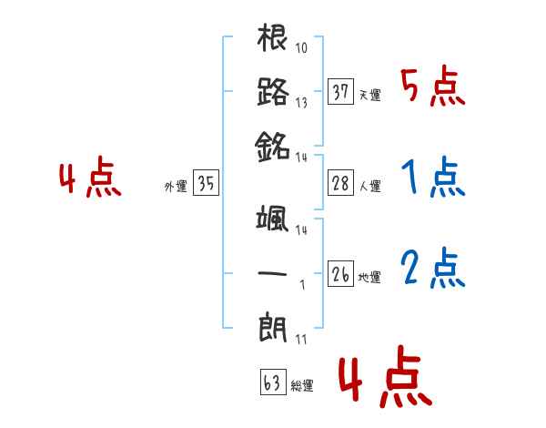 総運![]() | 根路銘颯一朗さんの総運は63画の4つ星!家庭運がよく順調な生活。温和な性格。 あなたの人生を表す1番重要な運勢です。生涯を通じて影響する総合運となり、主に50歳以降の晩年期に影響を及ぼします。 |