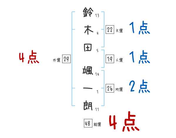 外運![]() | 鈴木田颯一朗さんの外運は29画の4つ星!完全主義で才能がある。厳格な心の持ち主。 生活面を象徴する運勢です。外部から受ける影響力を表し、結婚運、家庭運や職場、環境への順応性を表します。 |