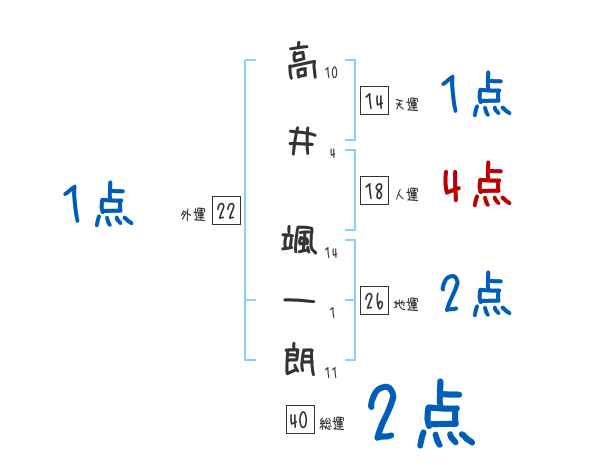外運![]() | 高井颯一朗さんの外運は22画の1つ星!努力することが苦手ないっぽう手先が器用。芸術性にも優れる。 生活面を象徴する運勢です。外部から受ける影響力を表し、結婚運、家庭運や職場、環境への順応性を表します。 |