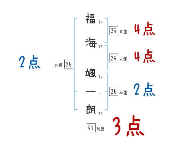 地運![]() | 福海颯一朗さんの地運は26画の2つ星!波瀾万丈かも。信頼できる人を大事にしましょう。 個性を表す基礎的な運勢です。性格形成や対人関係、行動力など家庭環境に影響されます。主に誕生してから20歳くらいまでの若年期の運勢を表します。 |