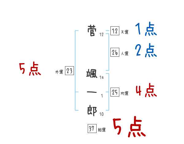 外運![]() | 菅颯一郎さんの外運は23画の5つ星!想像力に優れ活力がある。一代で成功し名誉を手に入れる。 生活面を象徴する運勢です。外部から受ける影響力を表し、結婚運、家庭運や職場、環境への順応性を表します。 |